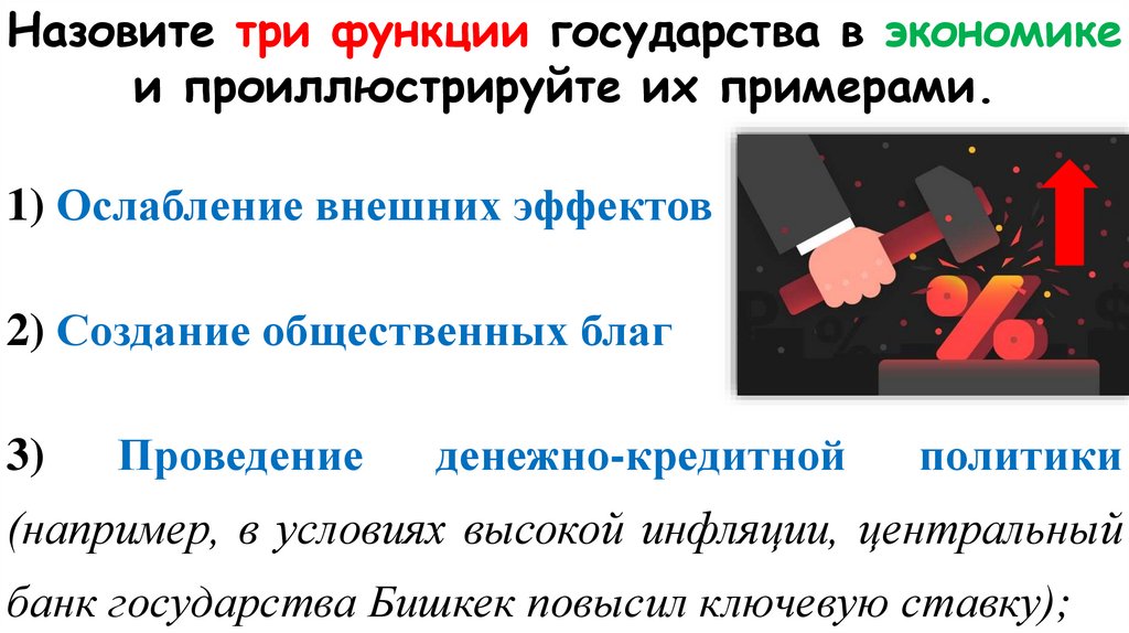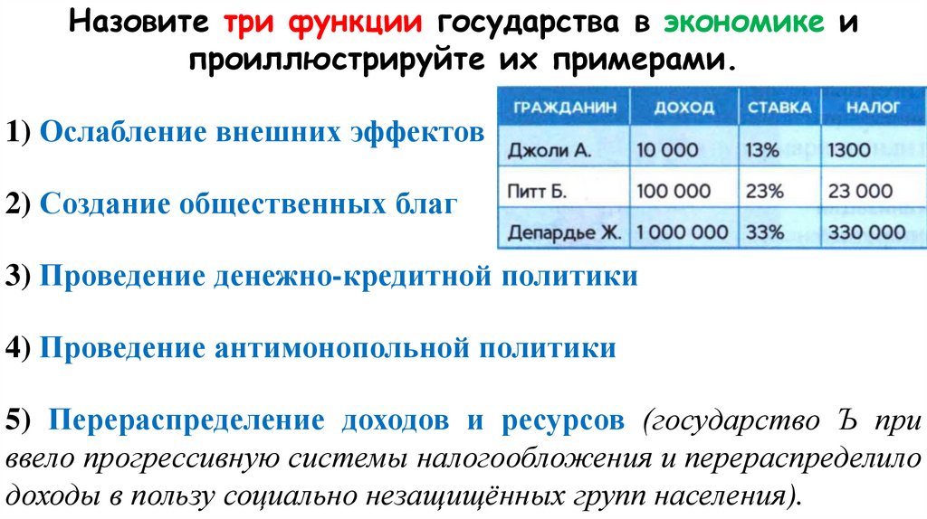 Назовите три функции государства в экономикеи проиллюстрируйте их примерами.