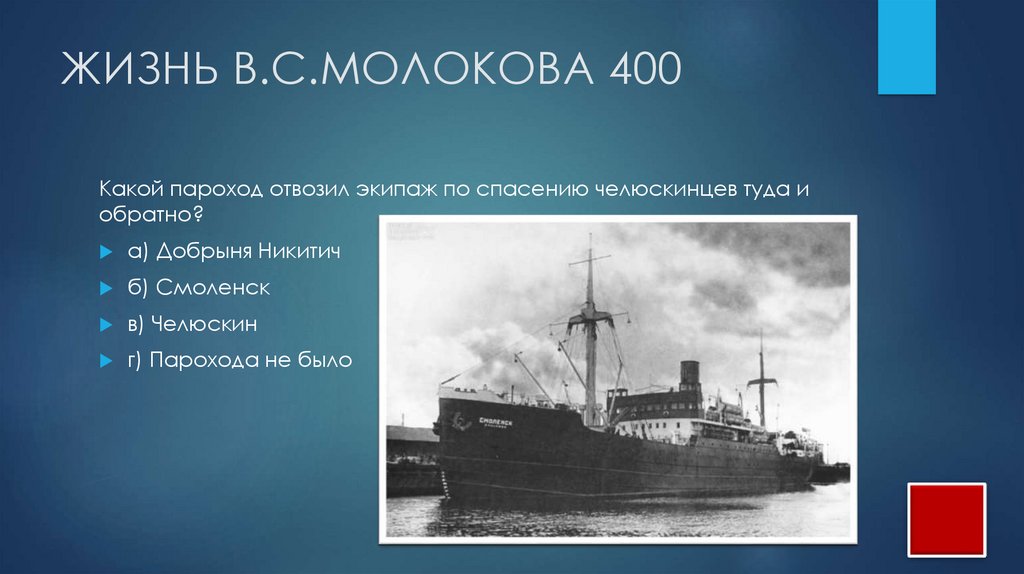 ЖИЗНЬ В.С.МОЛОКОВА 400Какой пароход отвозил экипаж по спасению челюскинцев туда и