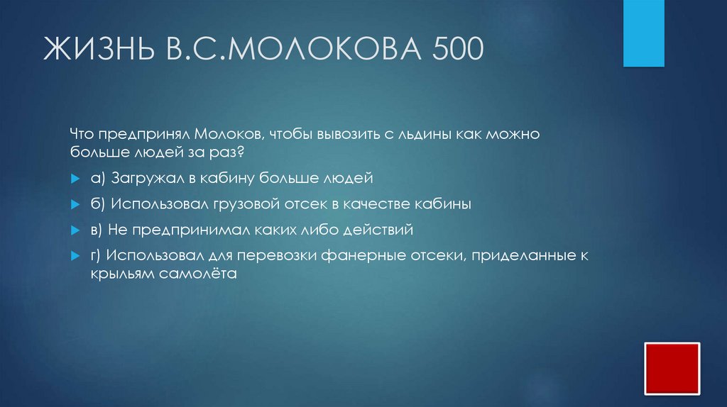 ЖИЗНЬ В.С.МОЛОКОВА 500Что предпринял Молоков, чтобы вывозить с льдины как можно