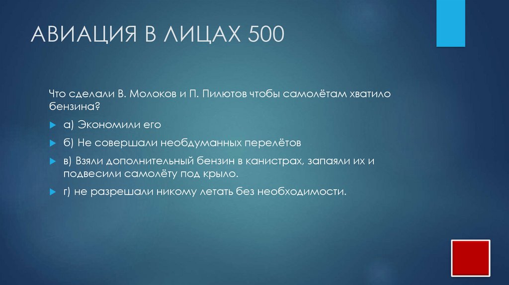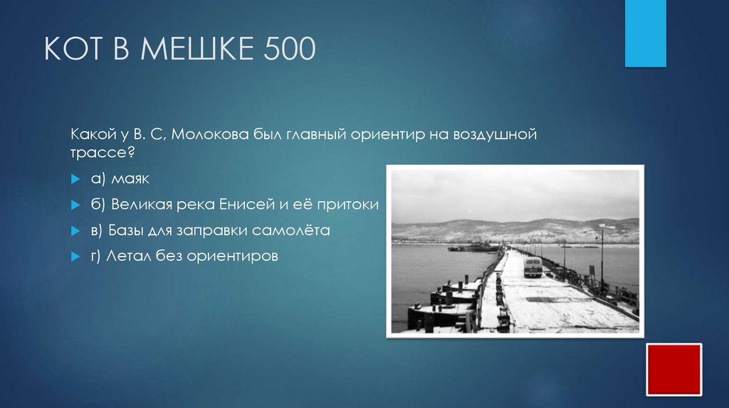 КОТ В МЕШКЕ 500Какой у В. С, Молокова был главный ориентир на воздушной