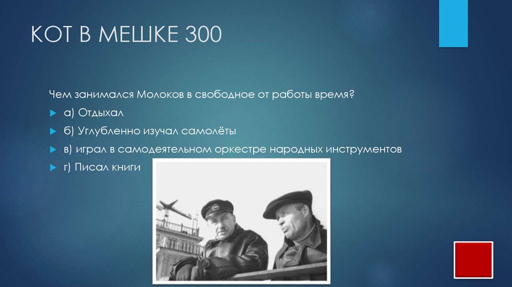 КОТ В МЕШКЕ 300Чем занимался Молоков в свободное от работы время?