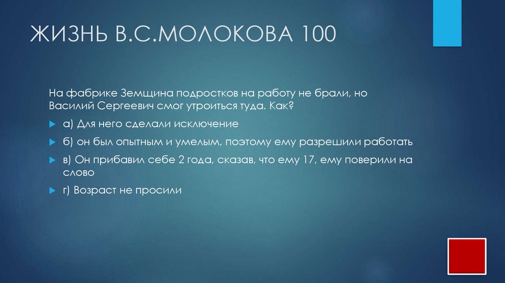 ЖИЗНЬ В.С.МОЛОКОВА 100На фабрике Земщина подростков на работу не брали, но