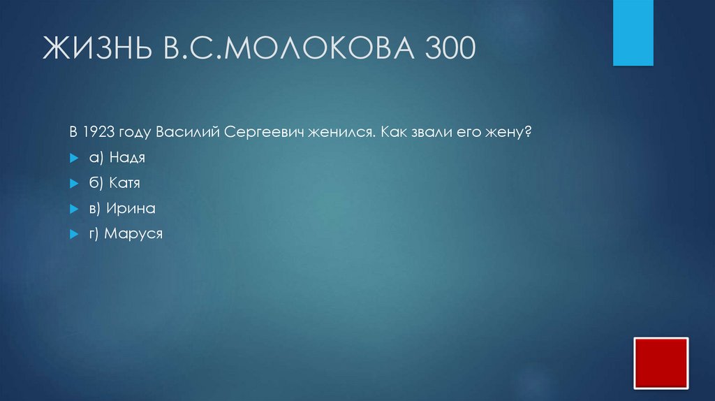 ЖИЗНЬ В.С.МОЛОКОВА 300В 1923 году Василий Сергеевич женился. Как звали его жену?