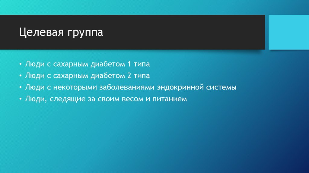 Целевая группа• Люди с сахарным диабетом 1 типа