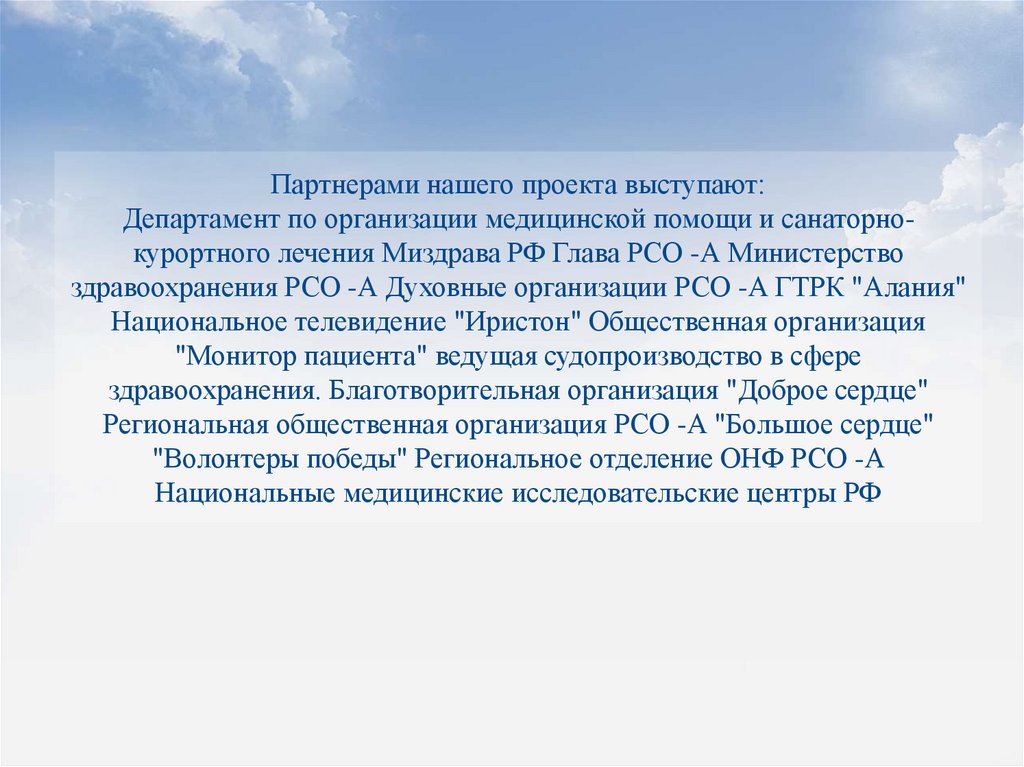 Партнерами нашего проекта выступают:Департамент по организации медицинской помощи и санаторнокурортного лечения Миздрава РФ Глава РСО -А Министерство