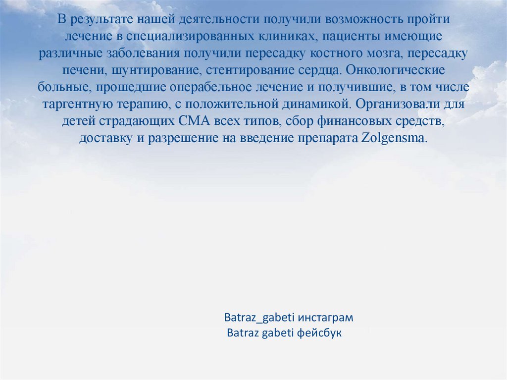 В результате нашей деятельности получили возможность пройтилечение в специализированных клиниках, пациенты имеющие