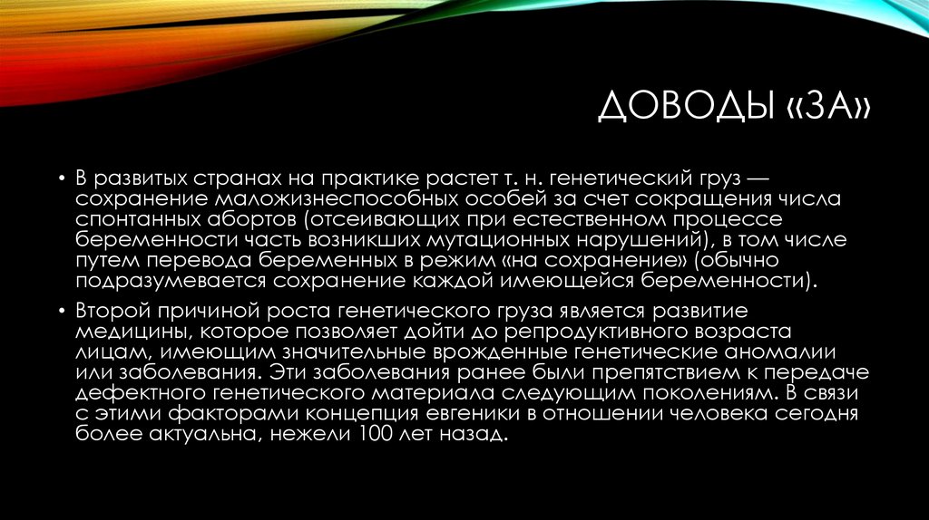 ДОВОДЫ «ЗА»• Способом сокращения генетического груза, помимо аборта,