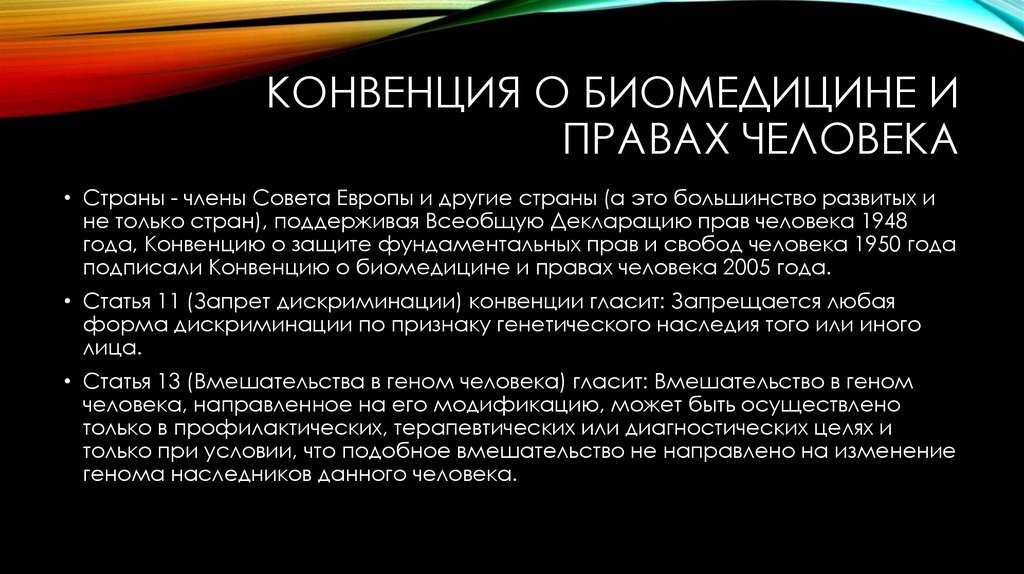 • Статья 13 (Вмешательства в геном человека) гласит: Вмешательство в геном
