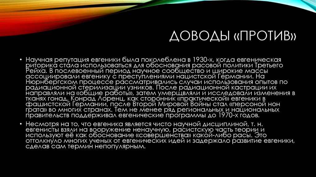 • Несмотря на то, что евгеника является чисто научной дисциплиной, т. н.