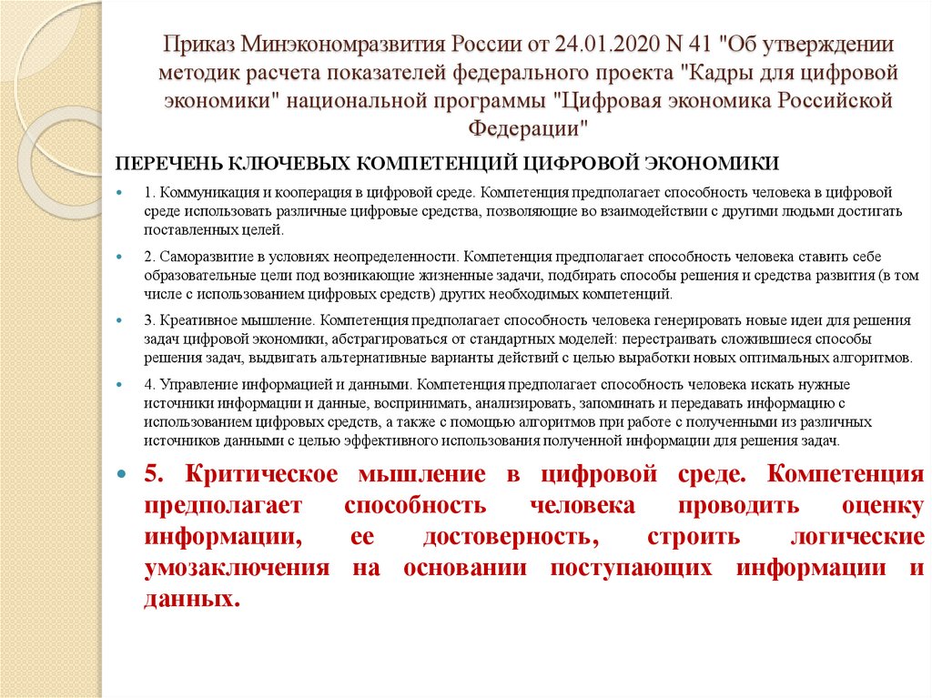 Приказ Минэкономразвития России от 24.01.2020 N 41 "Об утвержденииметодик расчета показателей федерального проекта "Кадры для цифровой