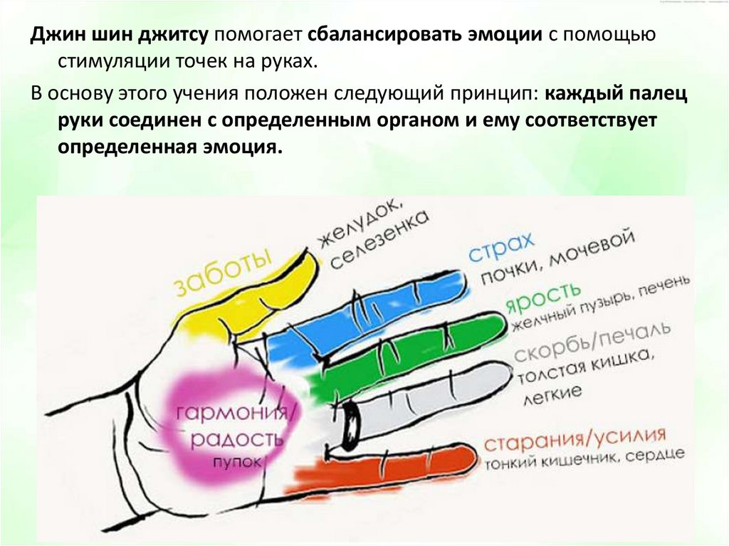 Джин шин джитсу помогает сбалансировать эмоции с помощьюстимуляции точек на руках.