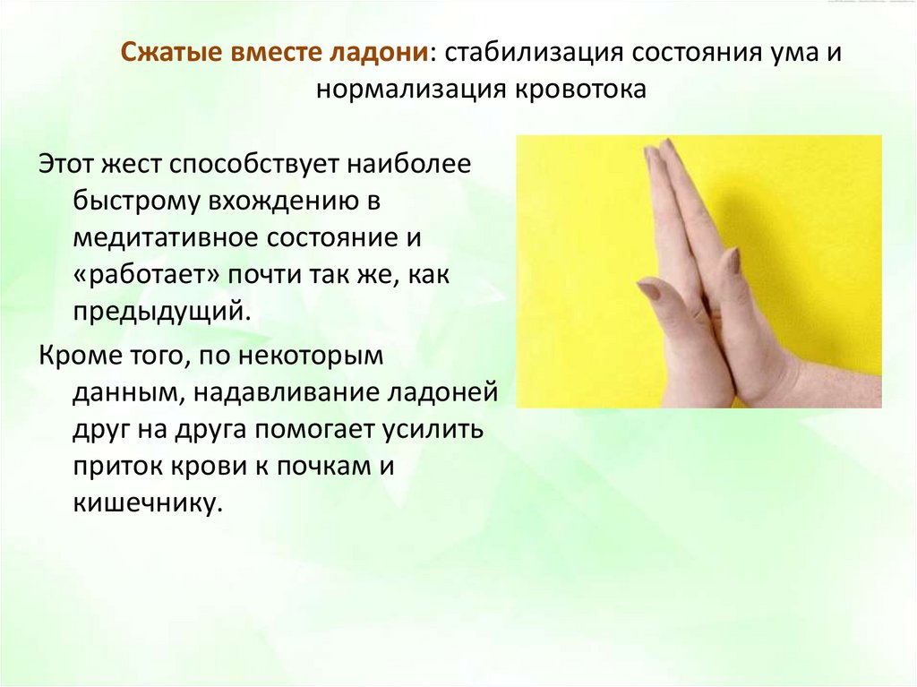 Сжатые вместе ладони: стабилизация состояния ума инормализация кровотока