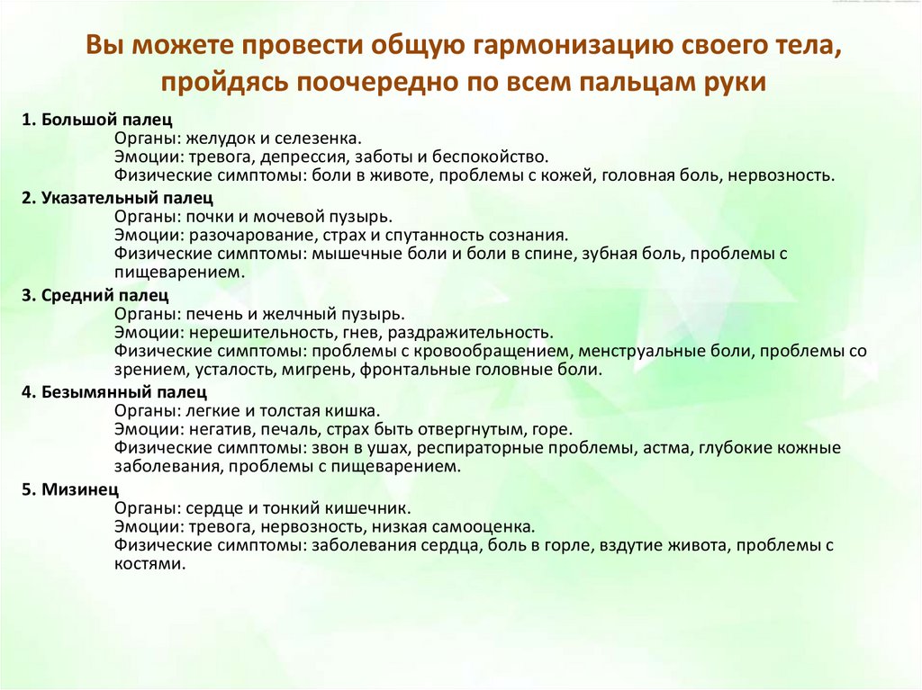 Вы можете провести общую гармонизацию своего тела,пройдясь поочередно по всем пальцам руки