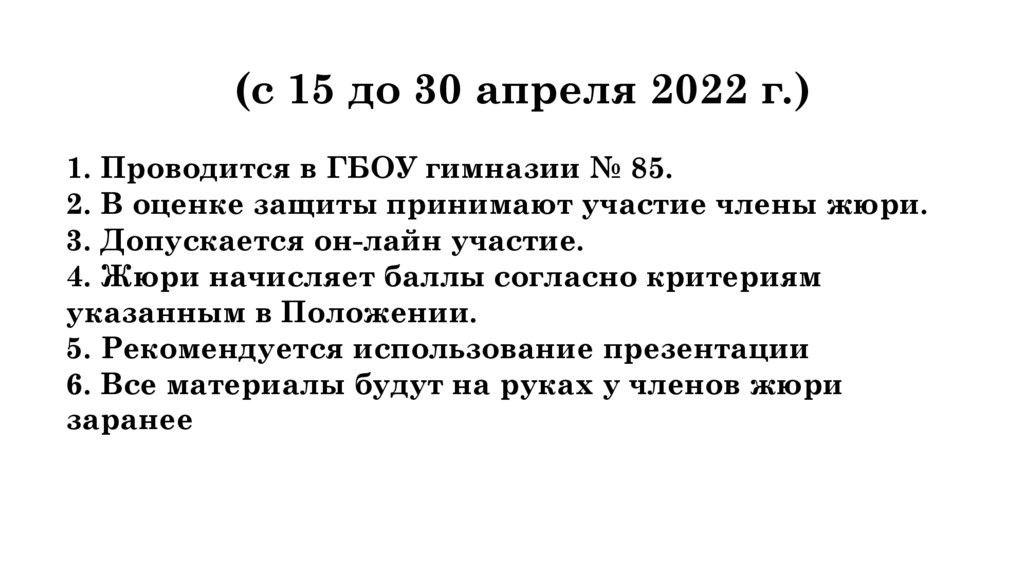 (с 15 до 30 апреля 2022 г.)1. Проводится в ГБОУ гимназии № 85.