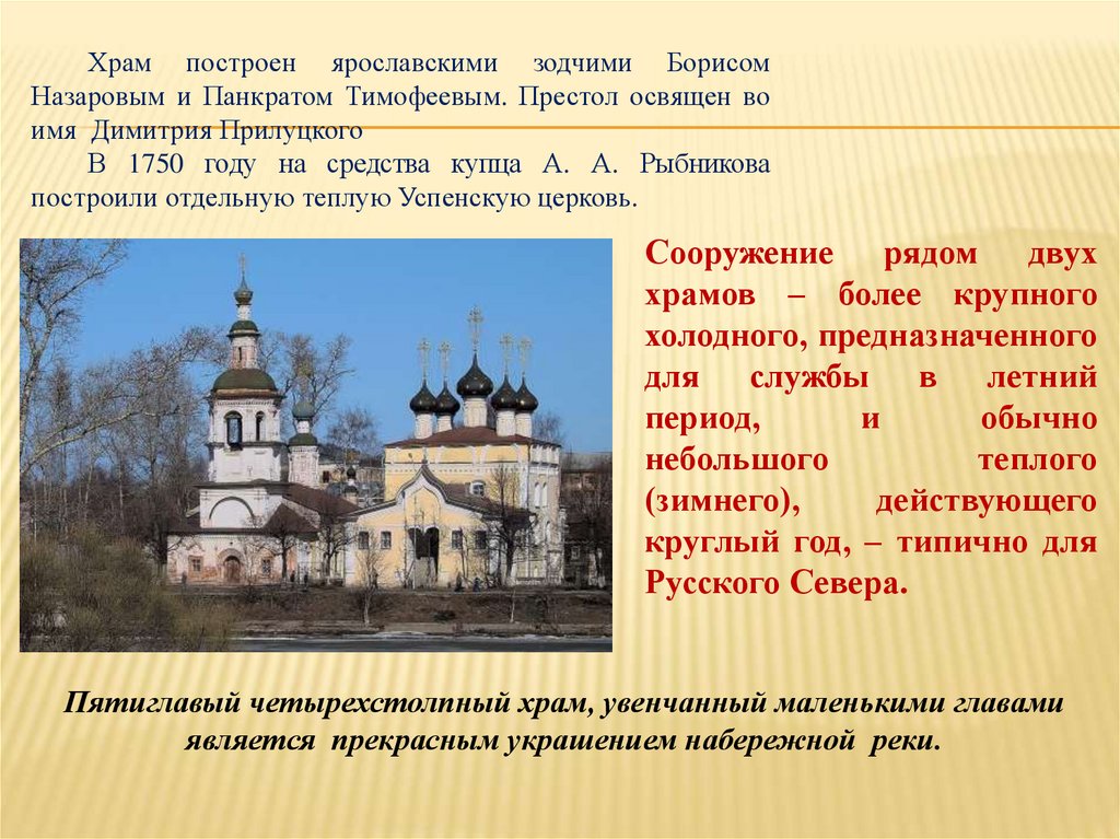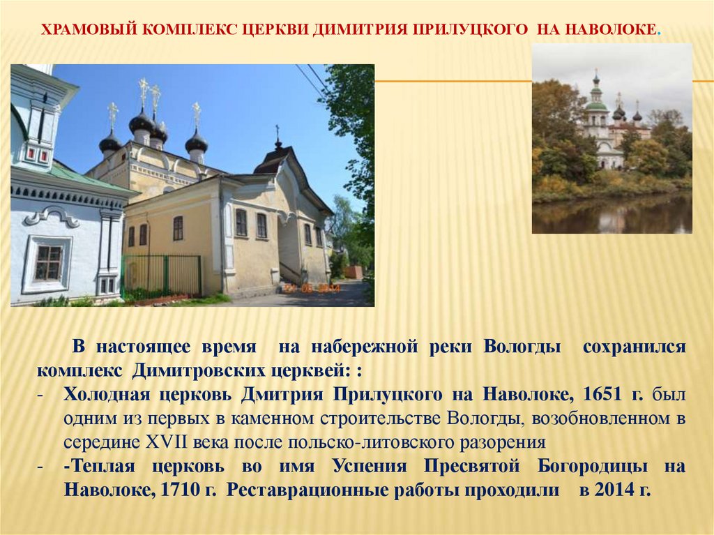 ХРАМОВЫЙ КОМПЛЕКС ЦЕРКВИ ДИМИТРИЯ ПРИЛУЦКОГО НА НАВОЛОКЕ.В настоящее время на набережной реки Вологды сохранился