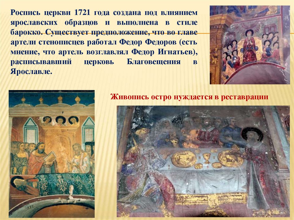 Роспись церкви 1721 года создана под влияниемярославских образцов и выполнена в стиле