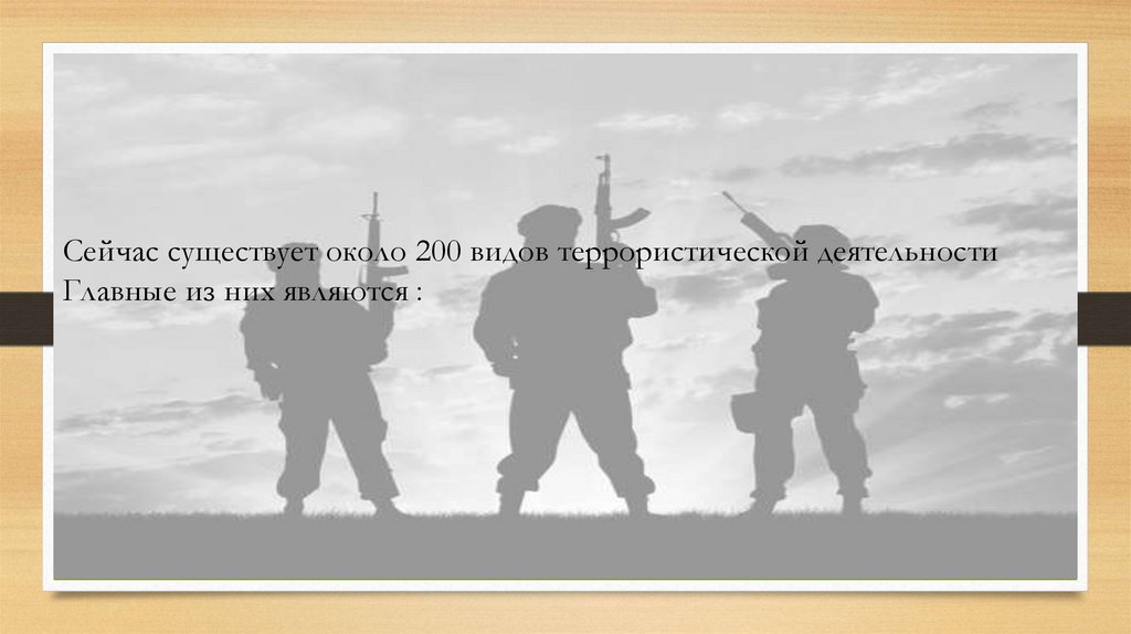 Сейчас существует около 200 видов террористической деятельностиГлавные из них являются :