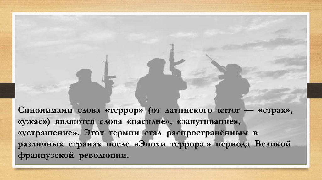 Синонимами слова «террор» (от латинского terror — «страх»,«ужас») являются слова «насилие», «запугивание»,