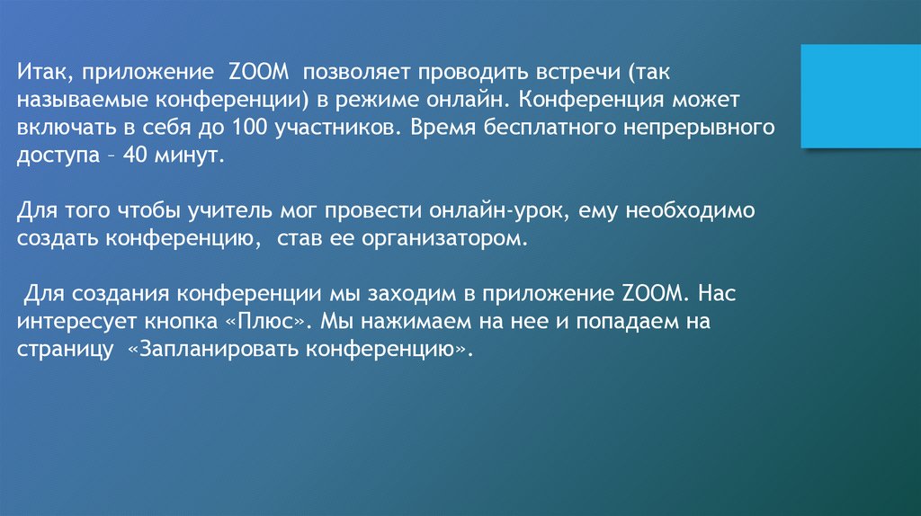 Итак, приложение ZOOM позволяет проводить встречи (такназываемые конференции) в режиме онлайн. Конференция может