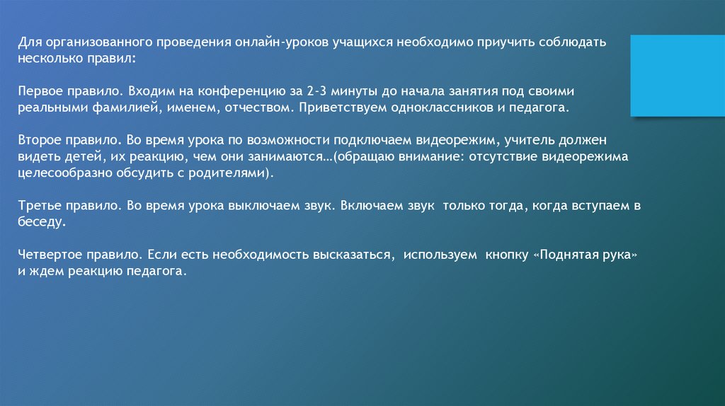 Для организованного проведения онлайн-уроков учащихся необходимо приучить соблюдатьнесколько правил: