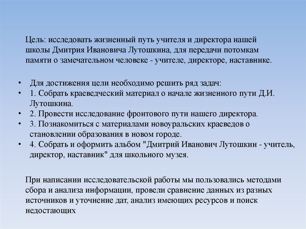 Цель: исследовать жизненный путь учителя и директора нашейшколы Дмитрия Ивановича Лутошкина, для передачи потомкам
