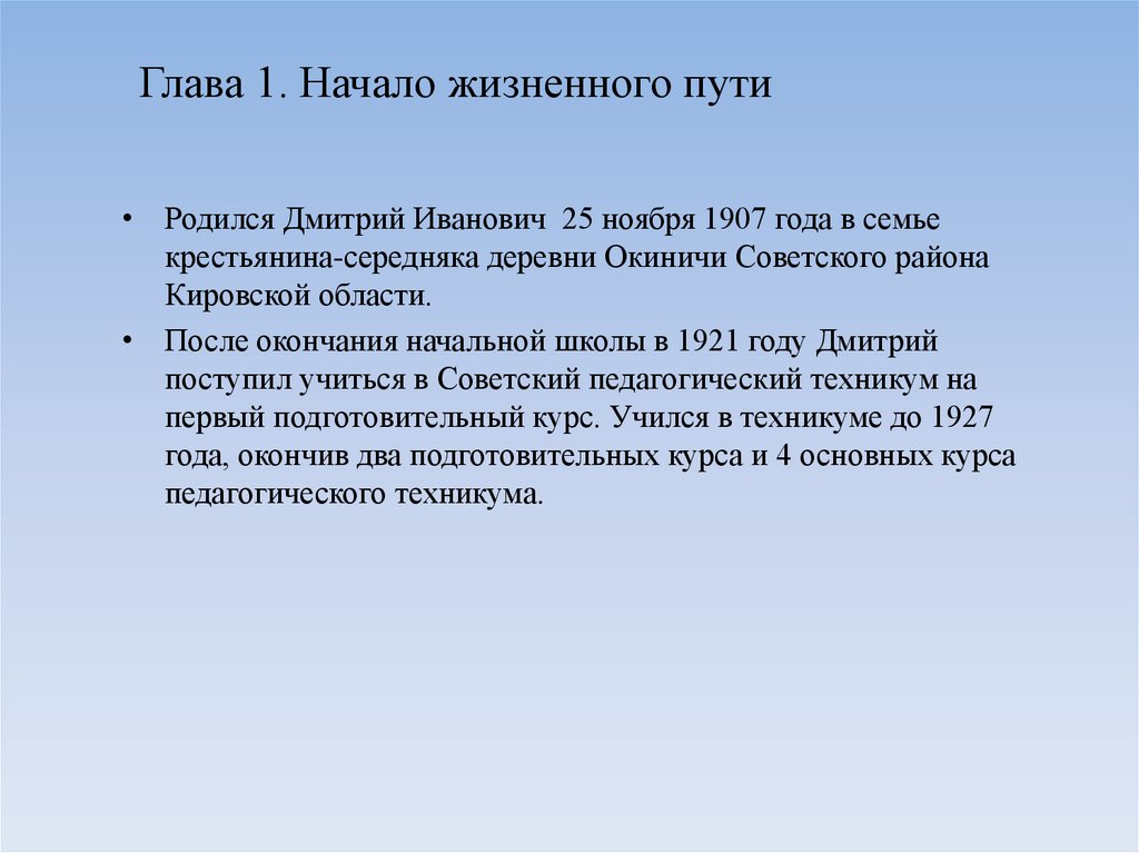 Глава 1. Начало жизненного пути• Родился Дмитрий Иванович 25 ноября 1907 года в семье