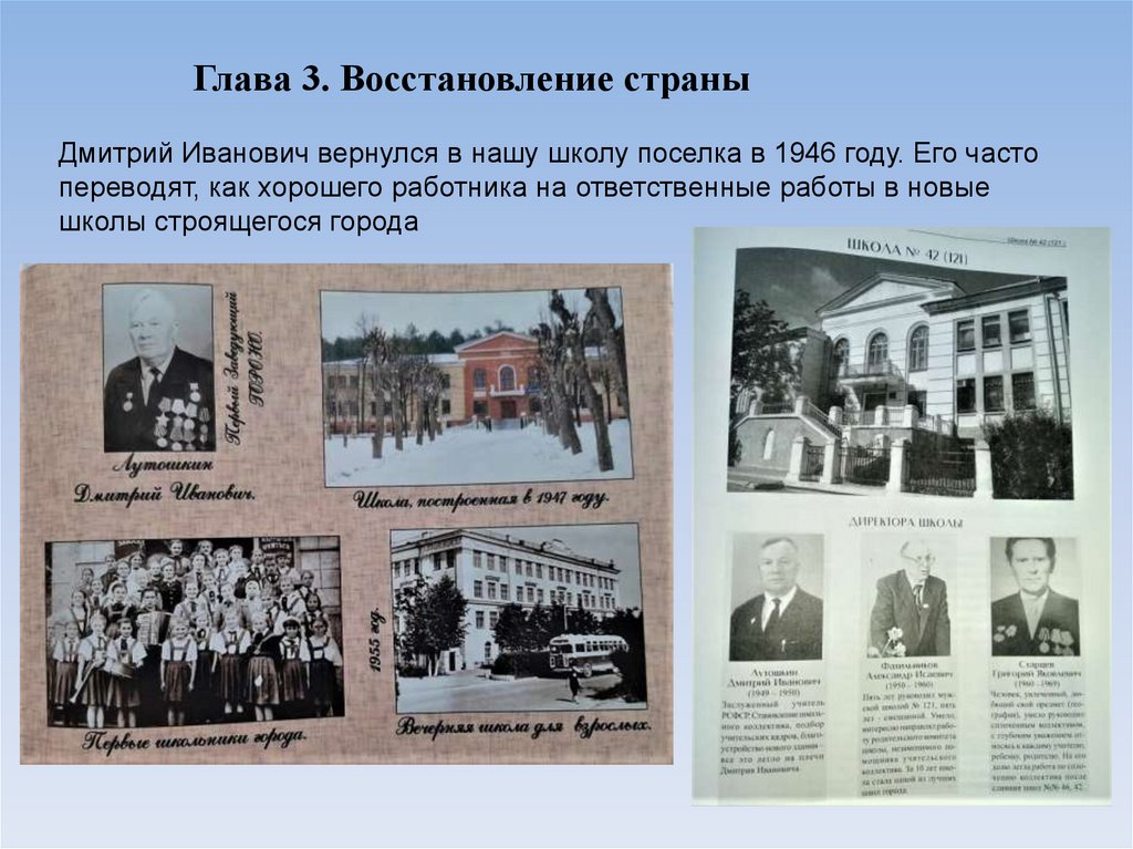 Глава 3. Восстановление страныДмитрий Иванович вернулся в нашу школу поселка в 1946 году. Его часто