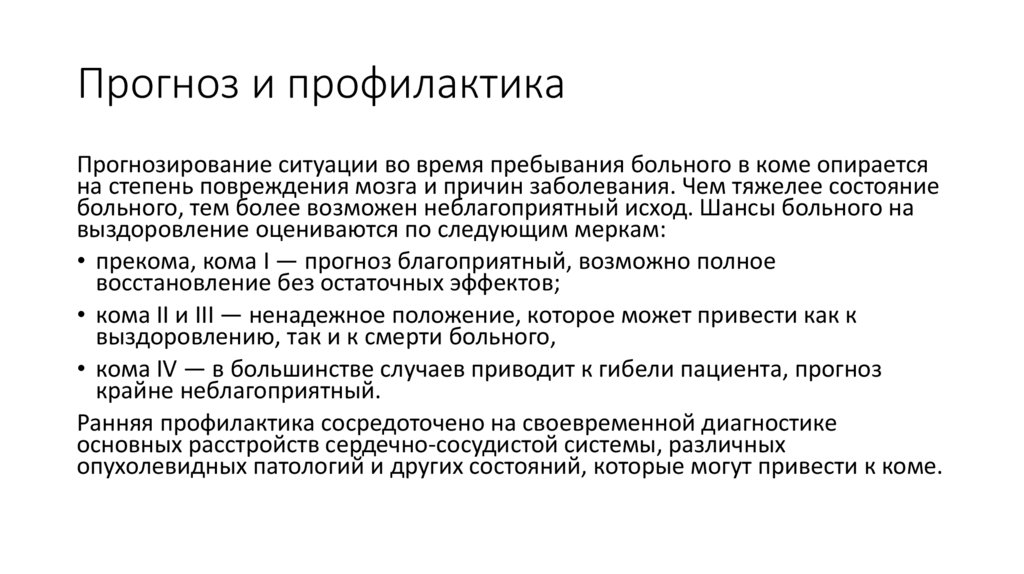 Прогноз и профилактикаПрогнозирование ситуации во время пребывания больного в коме опирается