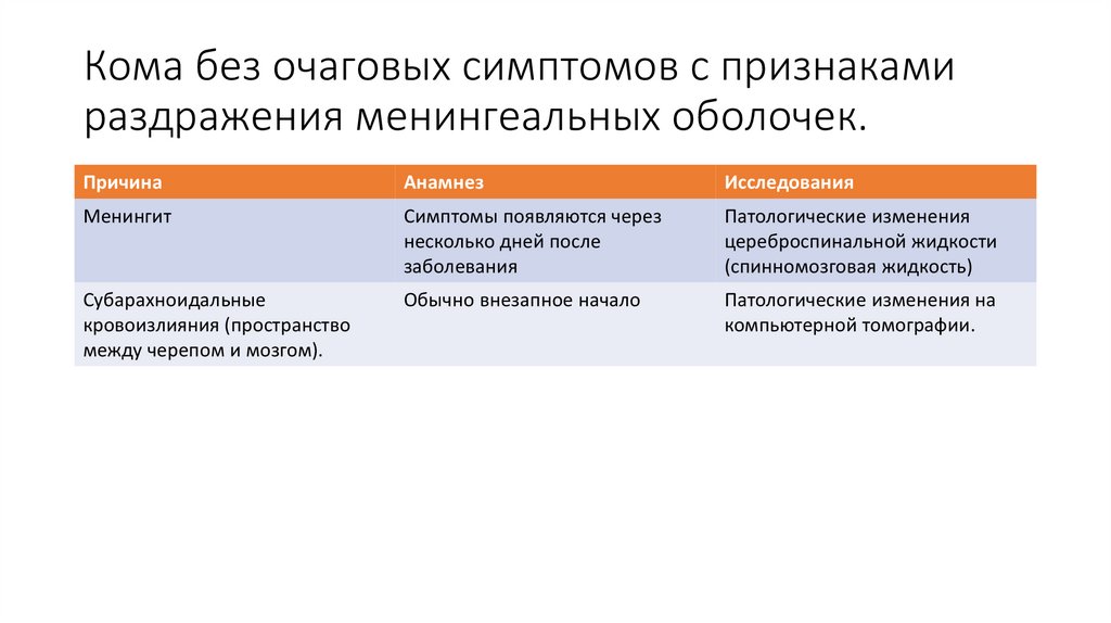 Кома без очаговых симптомов с признакамираздражения менингеальных оболочек.
