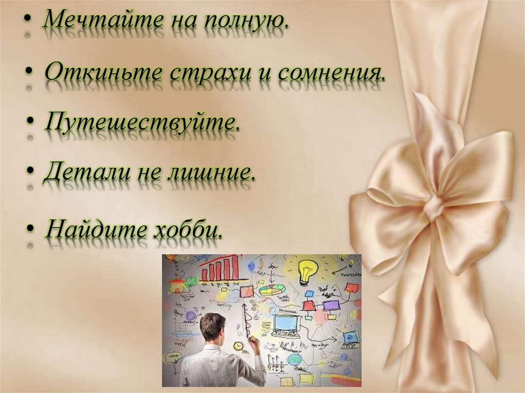• Мечтайте на полную.• Откиньте страхи и сомнения.