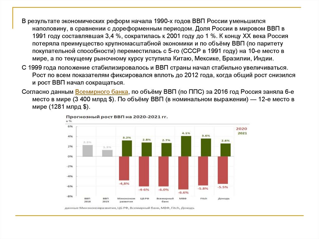 В результате экономических реформ начала 1990-х годов ВВП России уменьшилсянаполовину, в сравнении с дореформенным периодом. Доля России в мировом ВВП в