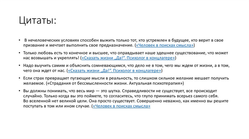 Цитаты:• В нечеловеческих условиях способен выжить только тот, кто устремлен в будущее, кто верит в свое