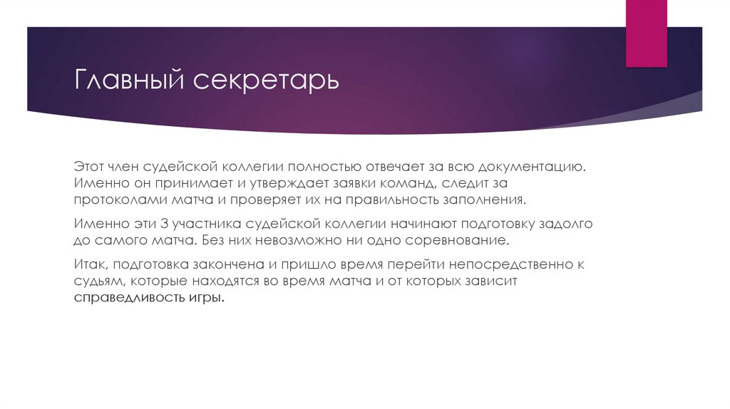 Заместитель главного судьиЗаместитель — правая рука главного судьи, его помощник во