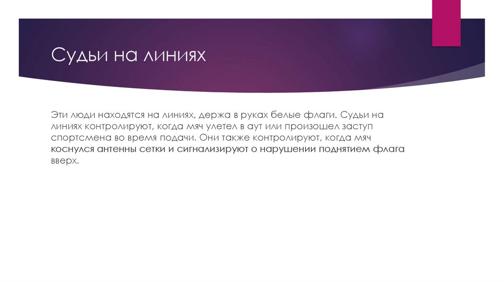 линиях контролируют, когда мяч улетел в аут или произошел заступ