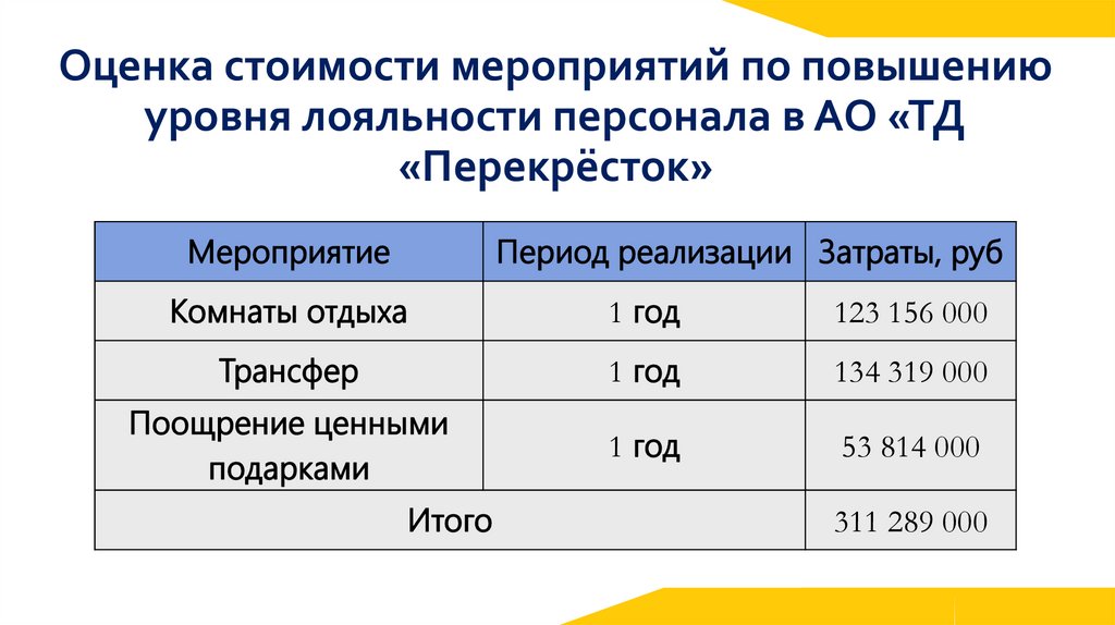 Оценка стоимости мероприятий по повышениюуровня лояльности персонала в АО «ТД