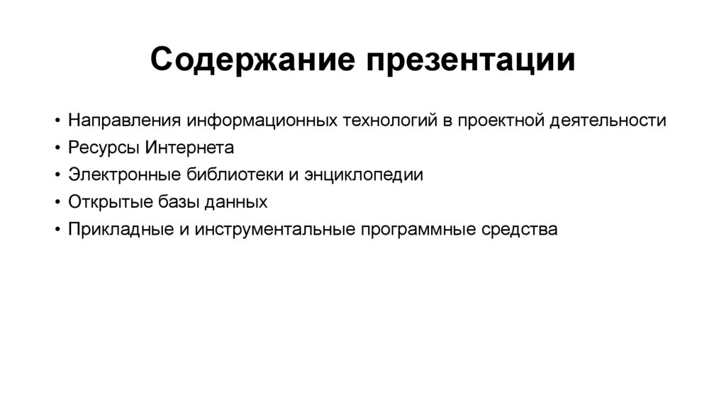 Содержание презентацииНаправления информационных технологий в проектной деятельности