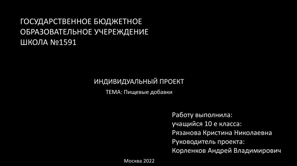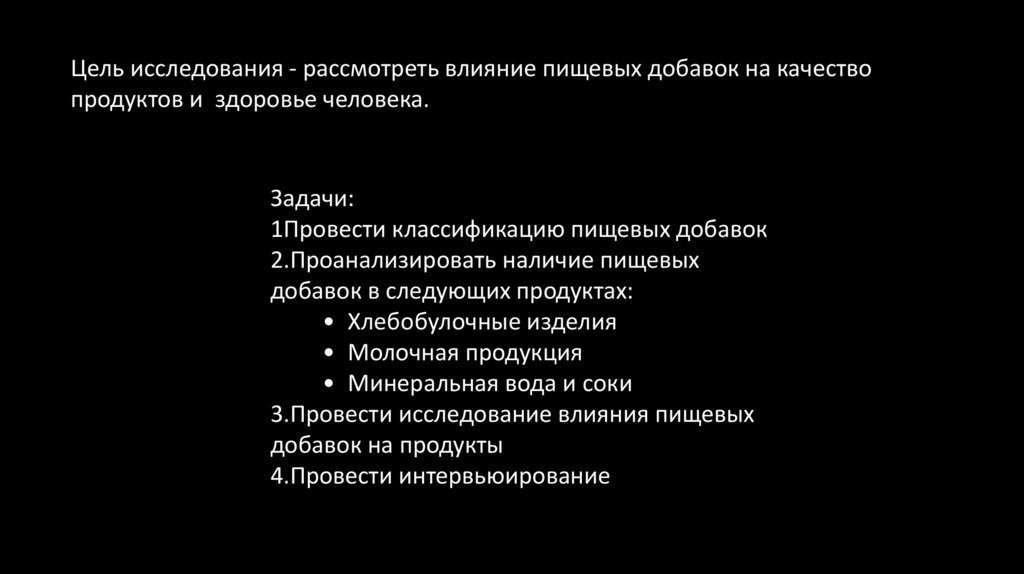 Цель исследования - рассмотреть влияние пищевых добавок на качествопродуктов и здоровье человека.