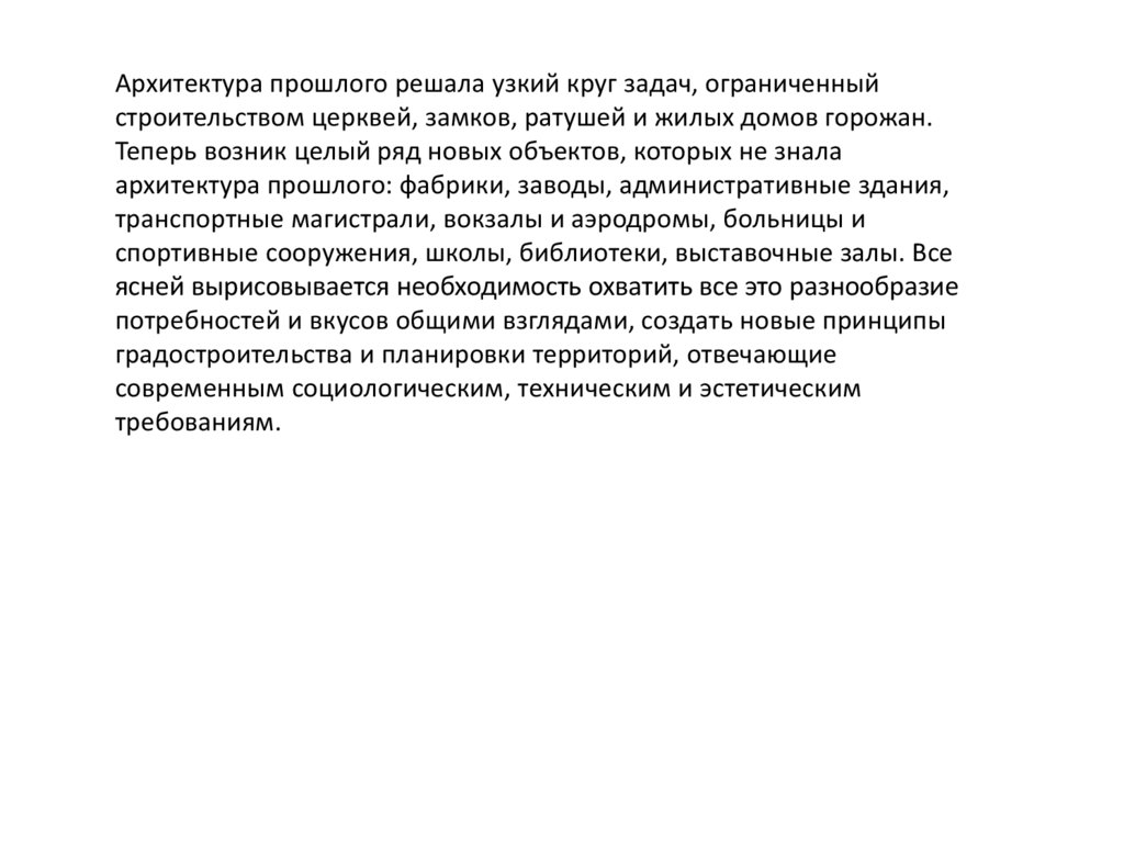 Архитектура прошлого решала узкий круг задач, ограниченныйстроительством церквей, замков, ратушей и жилых домов горожан.