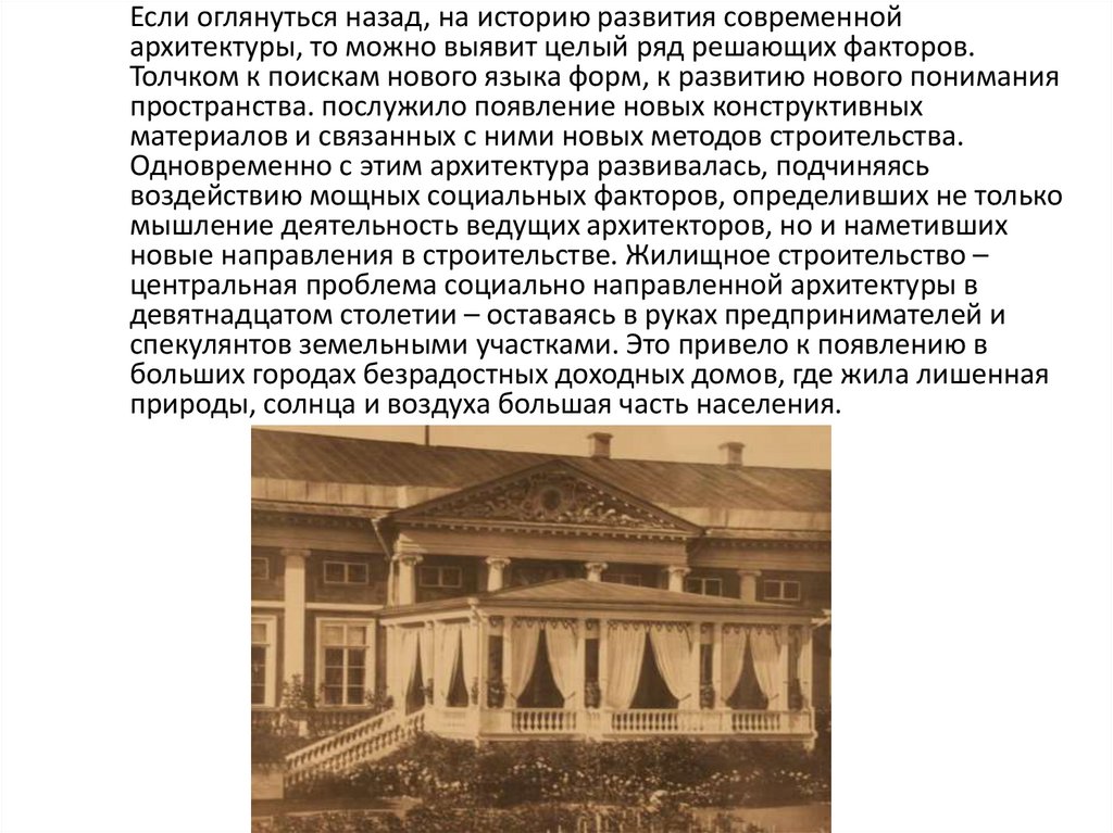 Если оглянуться назад, на историю развития современнойархитектуры, то можно выявит целый ряд решающих факторов.