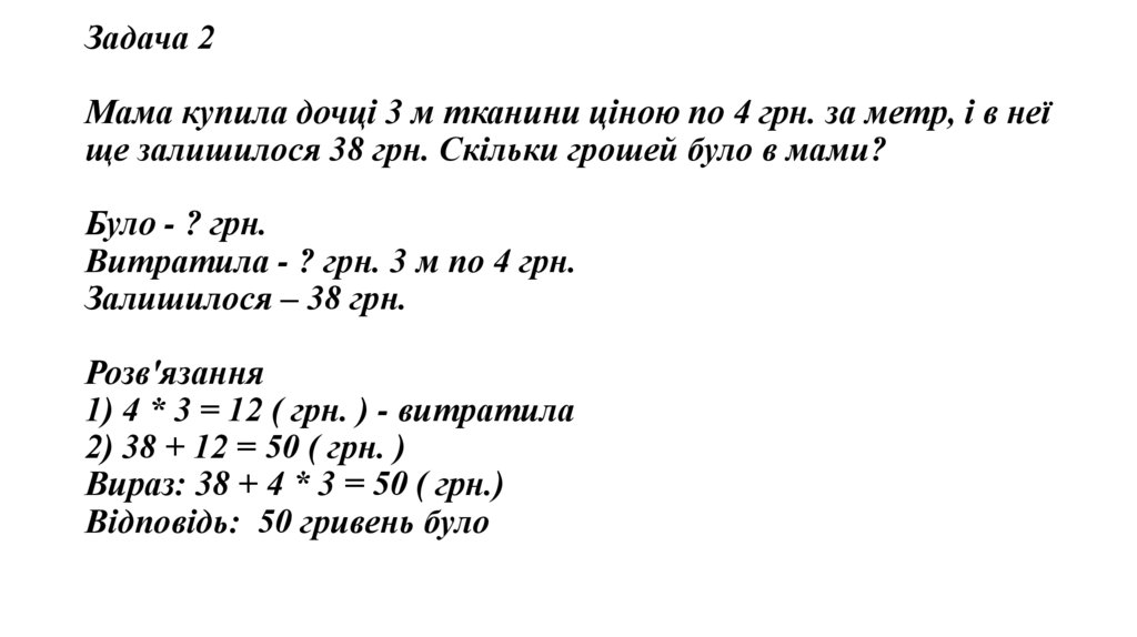 Задача 2Мама купила дочці 3 м тканини ціною по 4 грн. за метр, і в неї