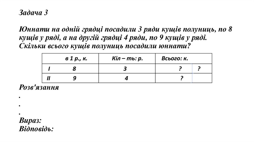 Задача 3Юннати на одній грядці посадили 3 ряди кущів полуниць, по 8
