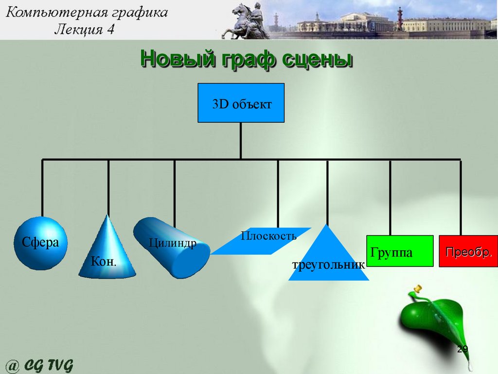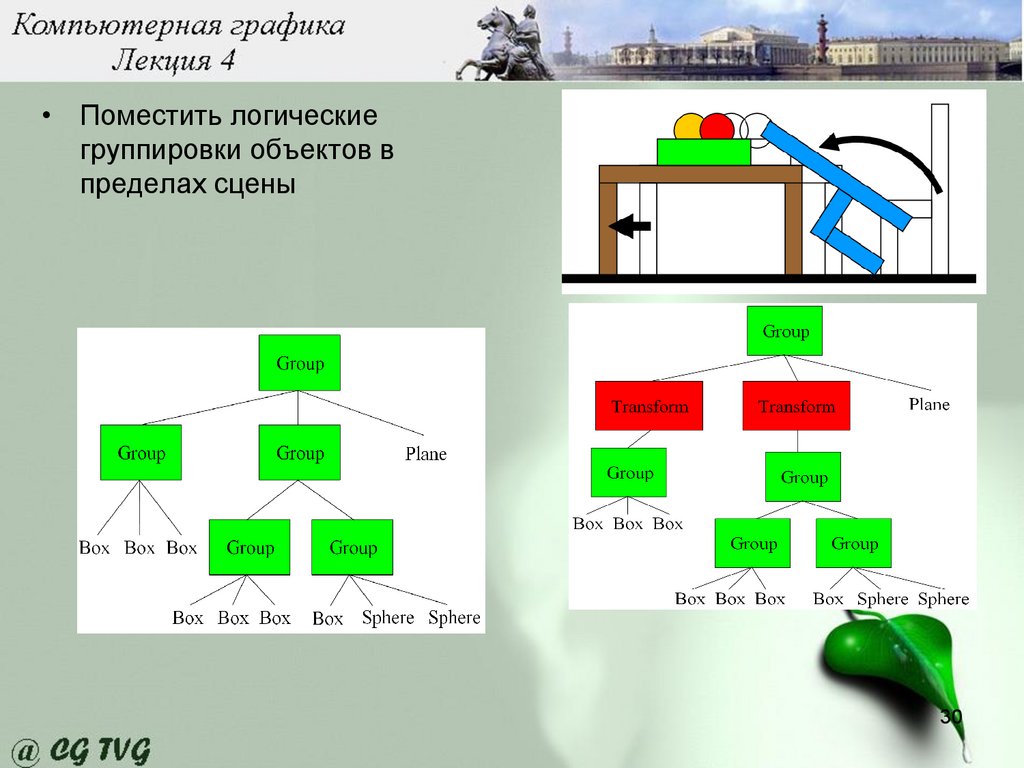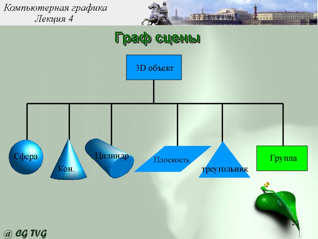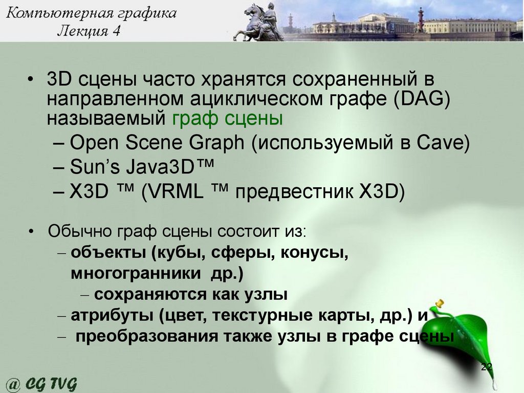 • 3D сцены часто хранятся сохраненный внаправленном ациклическом графе (DAG)