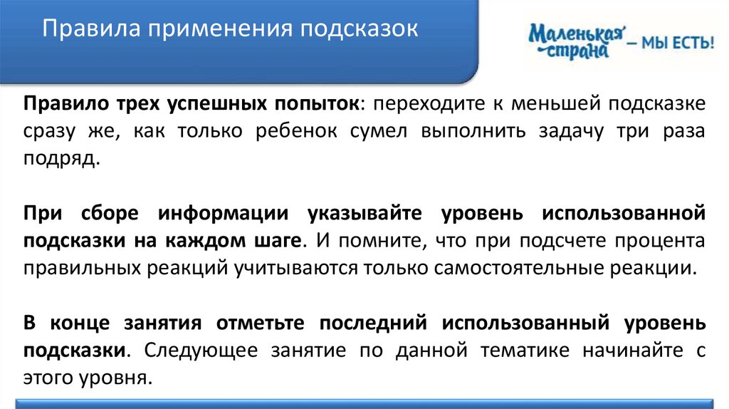 Правила применения подсказокПравило трех успешных попыток: переходите к меньшей подсказке