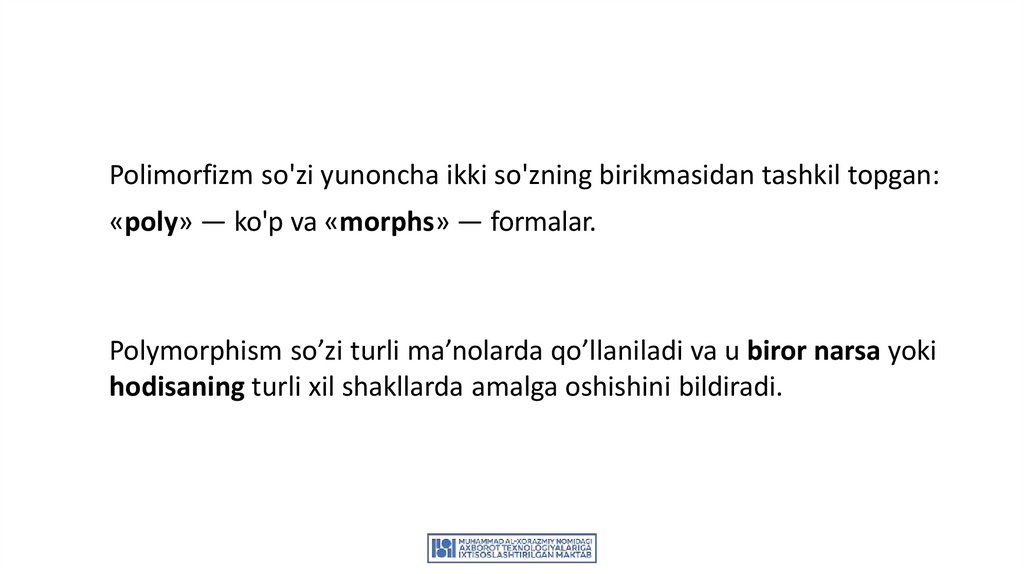 Polimorfizm so'zi yunoncha ikki so'zning birikmasidan tashkil topgan:«poly» — ko'p va «morphs» — formalar.