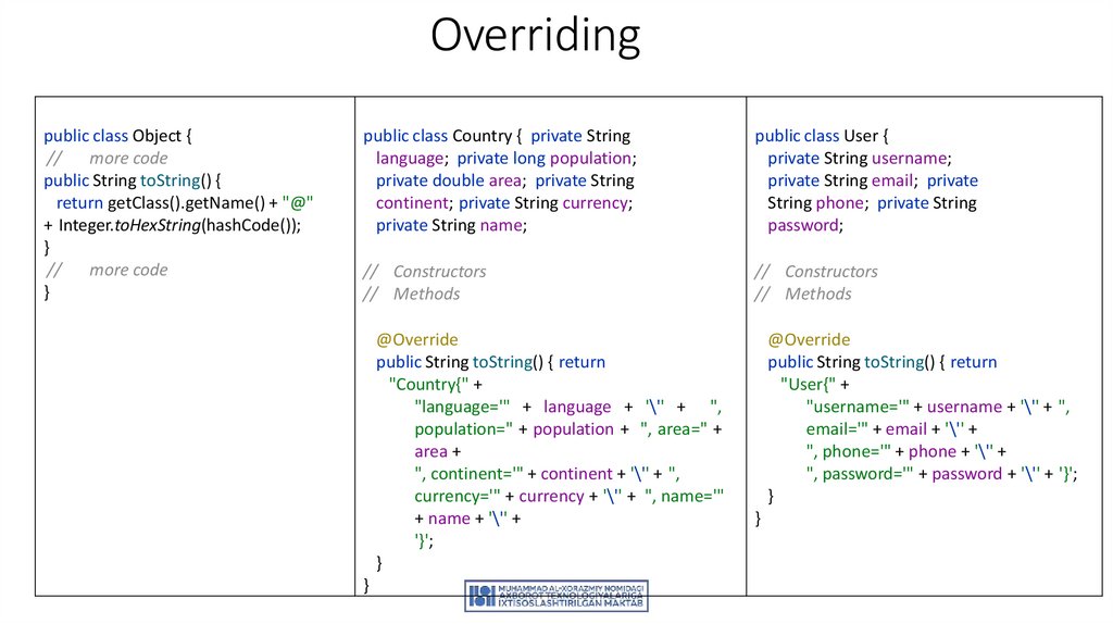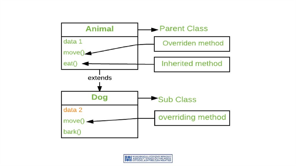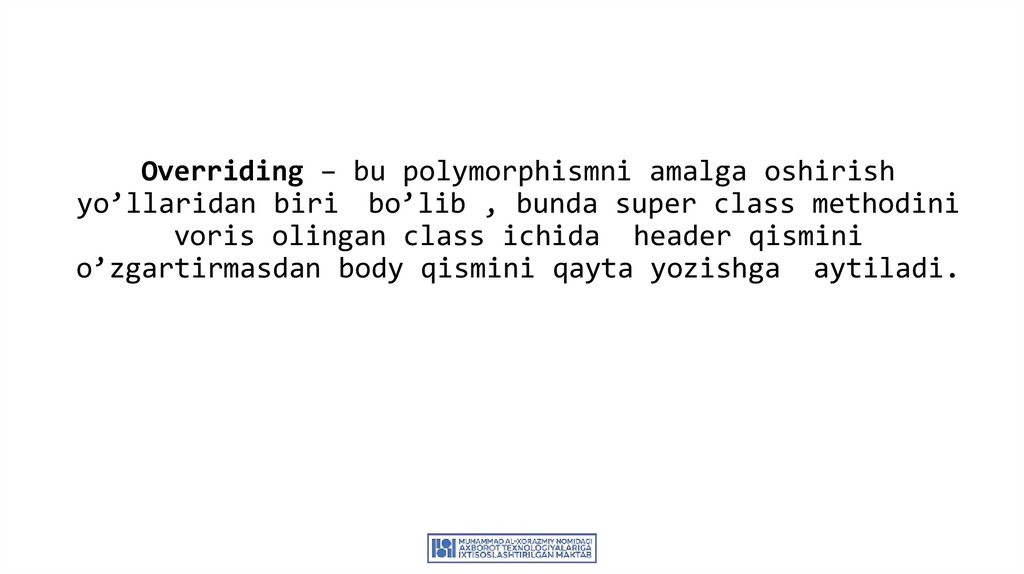 Overriding – bu polymorphismni amalga oshirishyo’llaridan biri bo’lib , bunda super class methodini