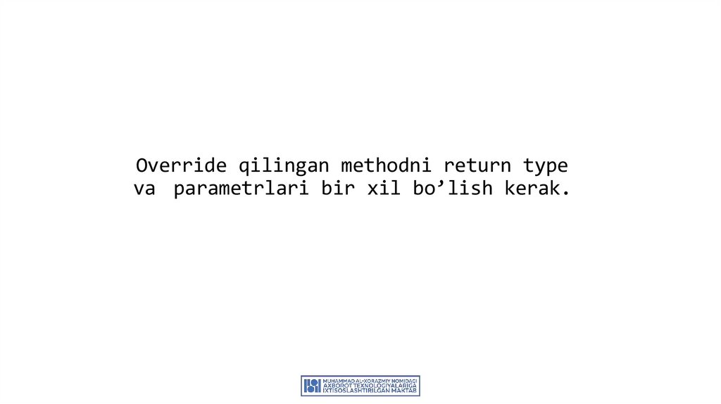 Override qilingan methodni return typeva parametrlari bir xil bo’lish kerak.