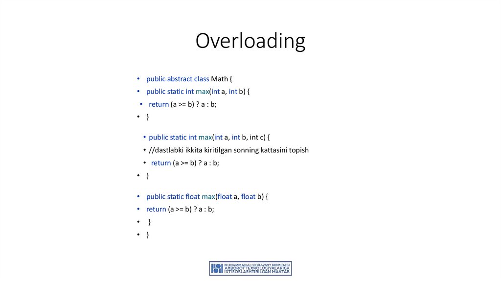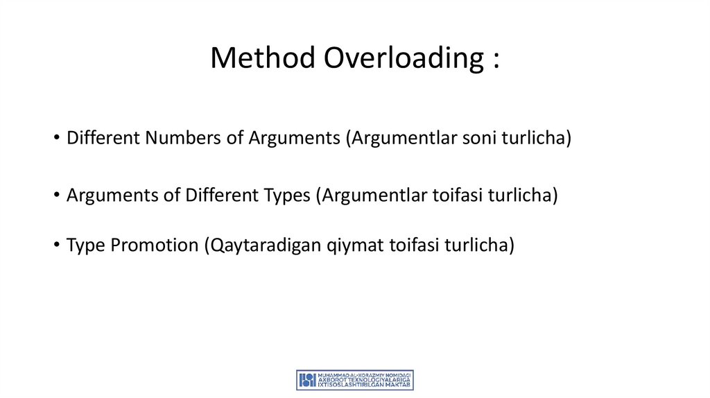 Method Overloading :• Different Numbers of Arguments (Argumentlar soni turlicha)
