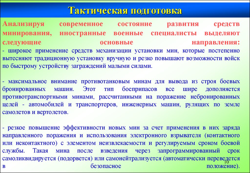 Тактическая подготовкаВ обороне минные заграждения предусматривается ставить для