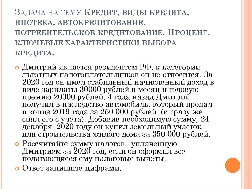 ЗАДАЧА НА ТЕМУ КРЕДИТ, ВИДЫ КРЕДИТА,ИПОТЕКА, АВТОКРЕДИТОВАНИЕ,
