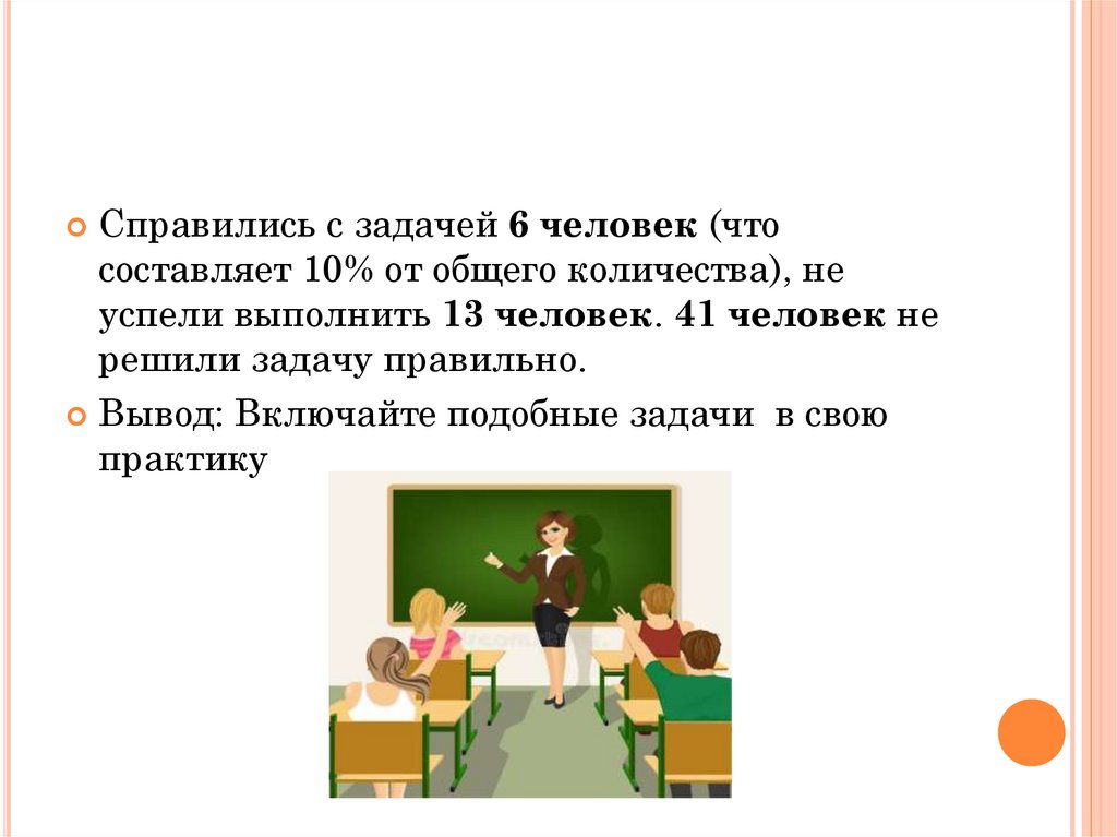Справились с задачей 6 человек (чтосоставляет 10% от общего количества), не